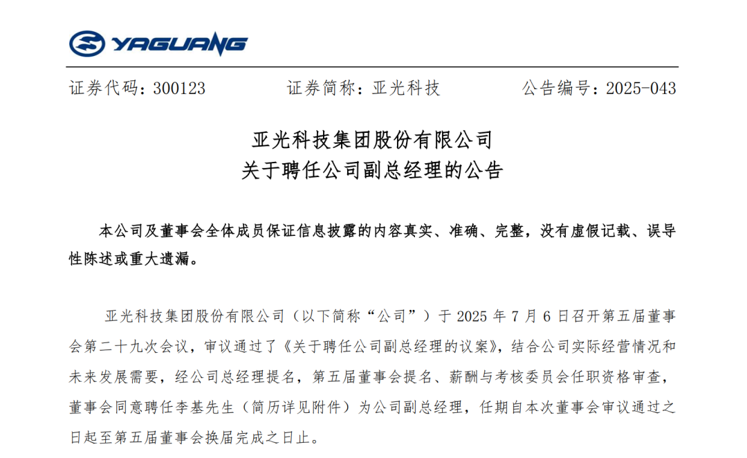 7月7日,亚光科技进一步发布《关于聘任公司副总经理的公告》,披露了该公司于2025年7月6日召开第五届董事会第二十九次会议,审议通过了《关于聘任公司副总经理的议案》,结合该公司实际经营情况和未来发展需要,经该公司总经理提名,第五届董事会提名、薪酬与考核委员会任职资格审查,董事会同意聘任李基为该公司副总经理,任期自该次董事会审议通过之日起至第五届董事会换届完成之日止。