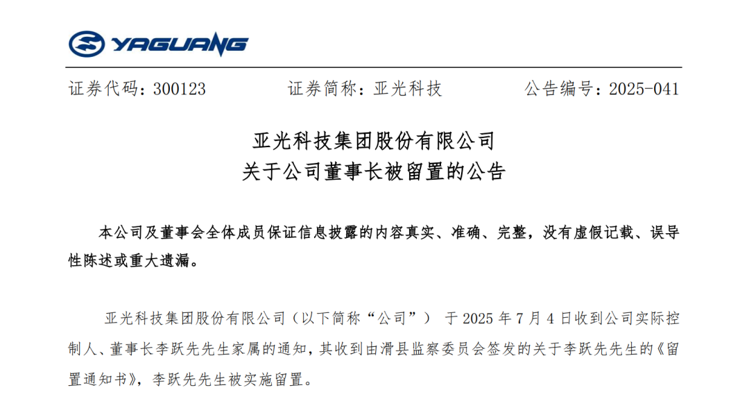 7月4日,亚光科技集团股份有限公司发布《关于公司董事长被留置的公告》,称于2025年7月4日收到公司实际控制人、董事长李跃先家属的通知股票杠杆什么,其收到由滑县监察委员会签发的关于李跃先的《留置通知书》,李跃先被实施留置。