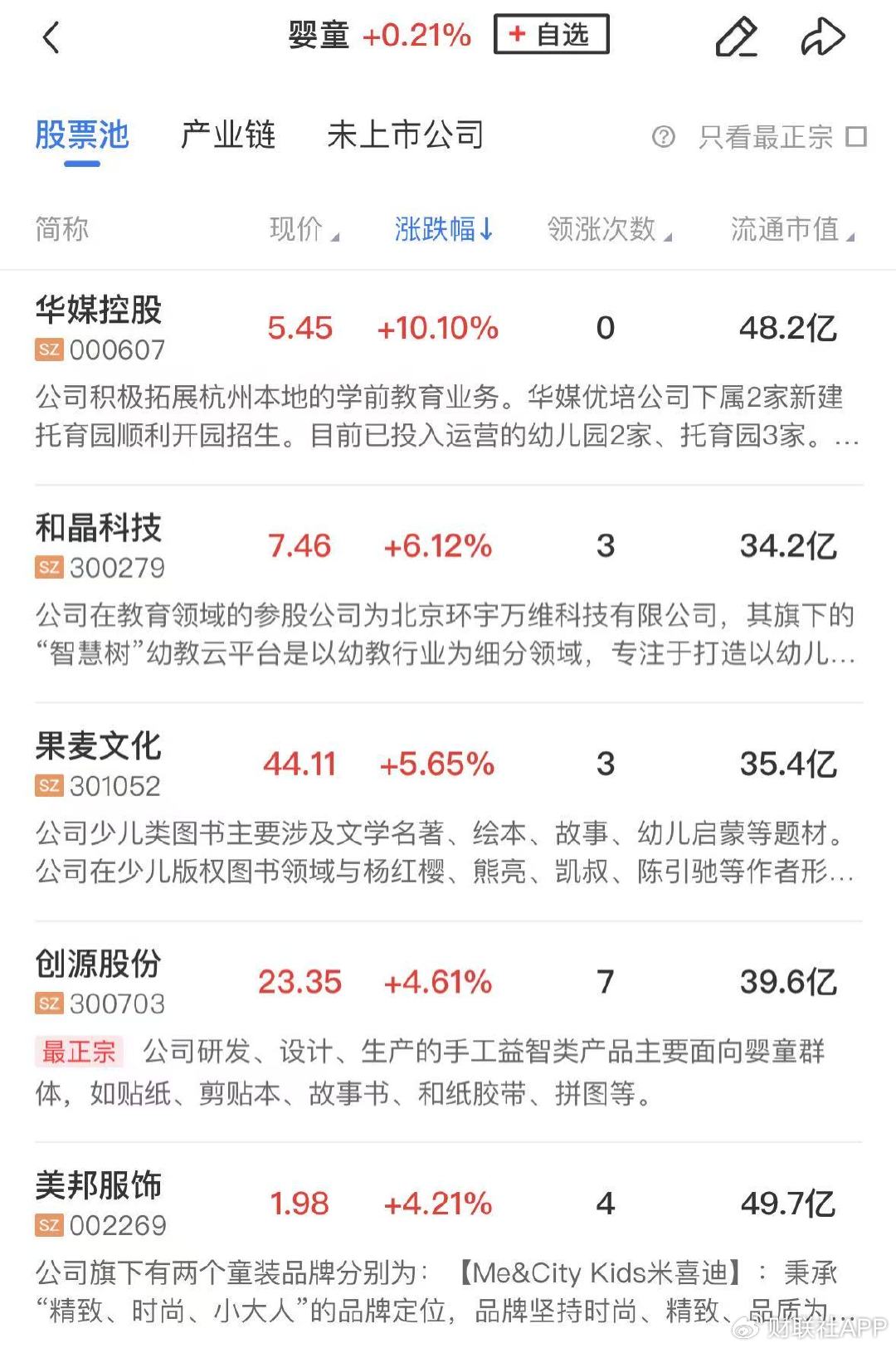 托育服务板块一度活跃,华媒控股涨停,和晶科技、爱婴室、景兴纸业、创源股份、孩子王等跟涨。消息面上,国家发改委等七部门联合发布《关于加快推进普惠托育服务体系建设的意见》,其中提出,支持用人单位利用存量土地或设施规划建设托育服务设施;明确发展“1+N”的托育服务体系。