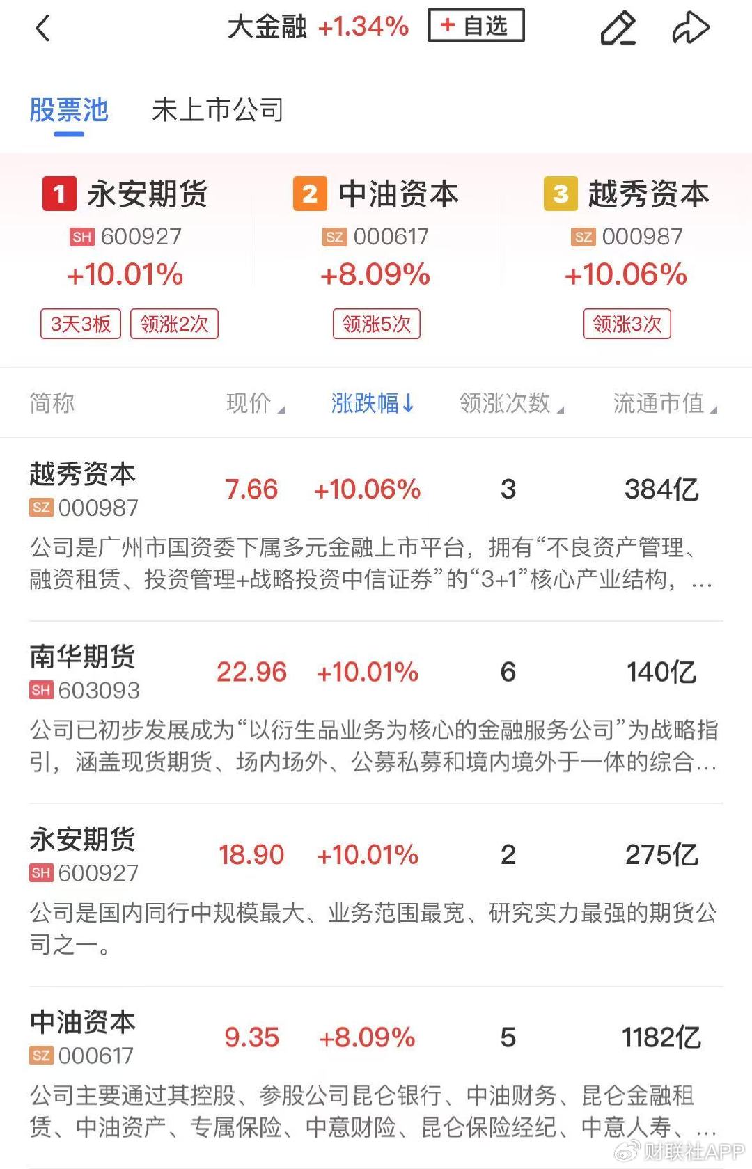 板块上,大金融板块再度活跃,工商银行、农业银行、邮储银行、中信银行再创历史新高。多元金融方向同样领涨,越秀资本、南华期货、永安期货涨停,中油资本、中粮资本涨幅居前。