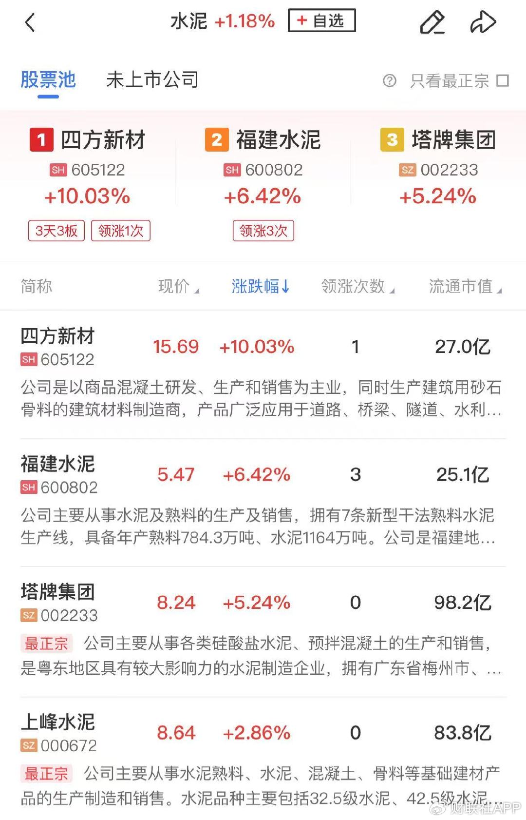 水泥板块同样于盘中冲高,四方新材涨停,福建水泥、塔牌集团、上峰水泥等个股跟涨。